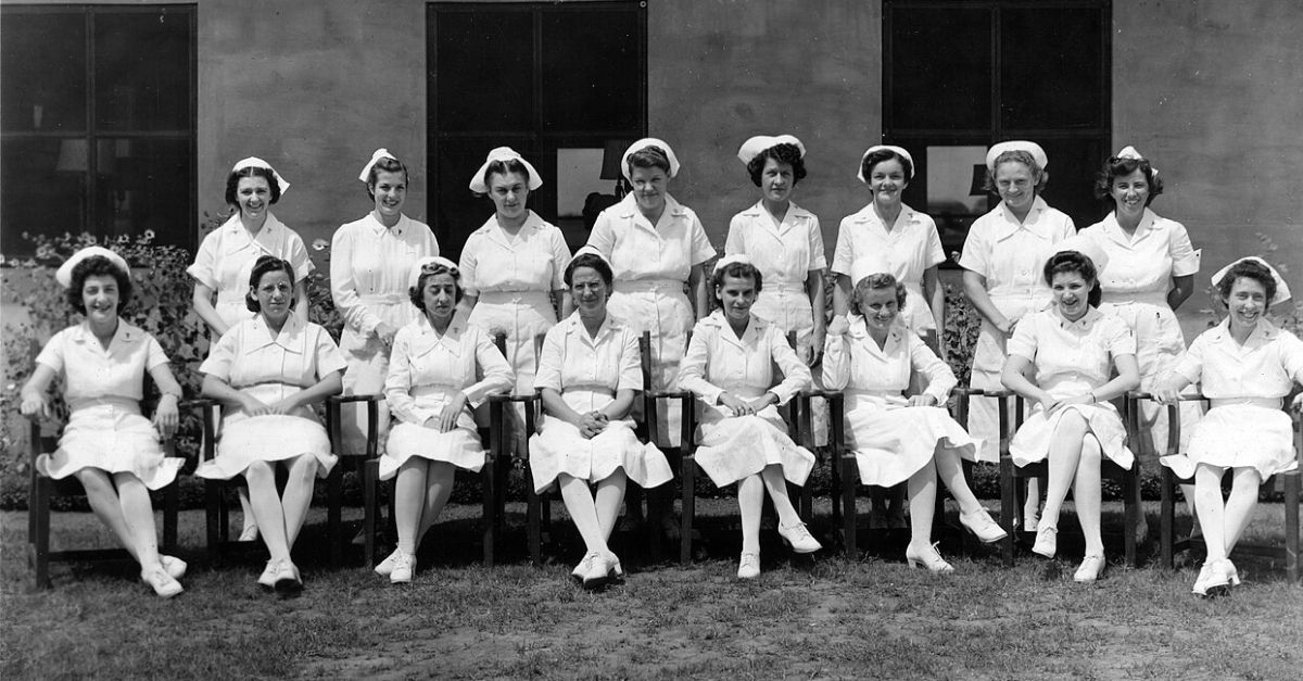 These WWII nurses sit together during a quiet moment, dressed in regulation white uniforms with signature caps. Their clothing reflects wartime standards, where function and cleanliness shaped how women appeared in service roles.