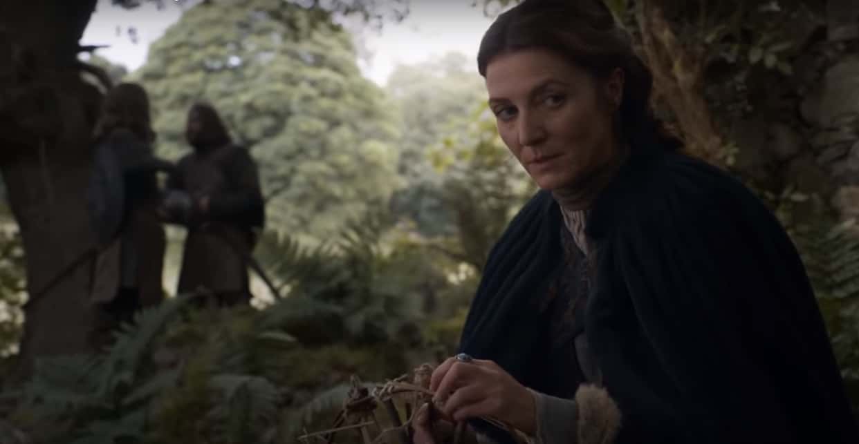 Arya and the rest of the Stark children get their own direwolf puppies. Arya names her wolf “Nymeria” after a woman who sailed 10,000 ships and became the ruler of Dorne.