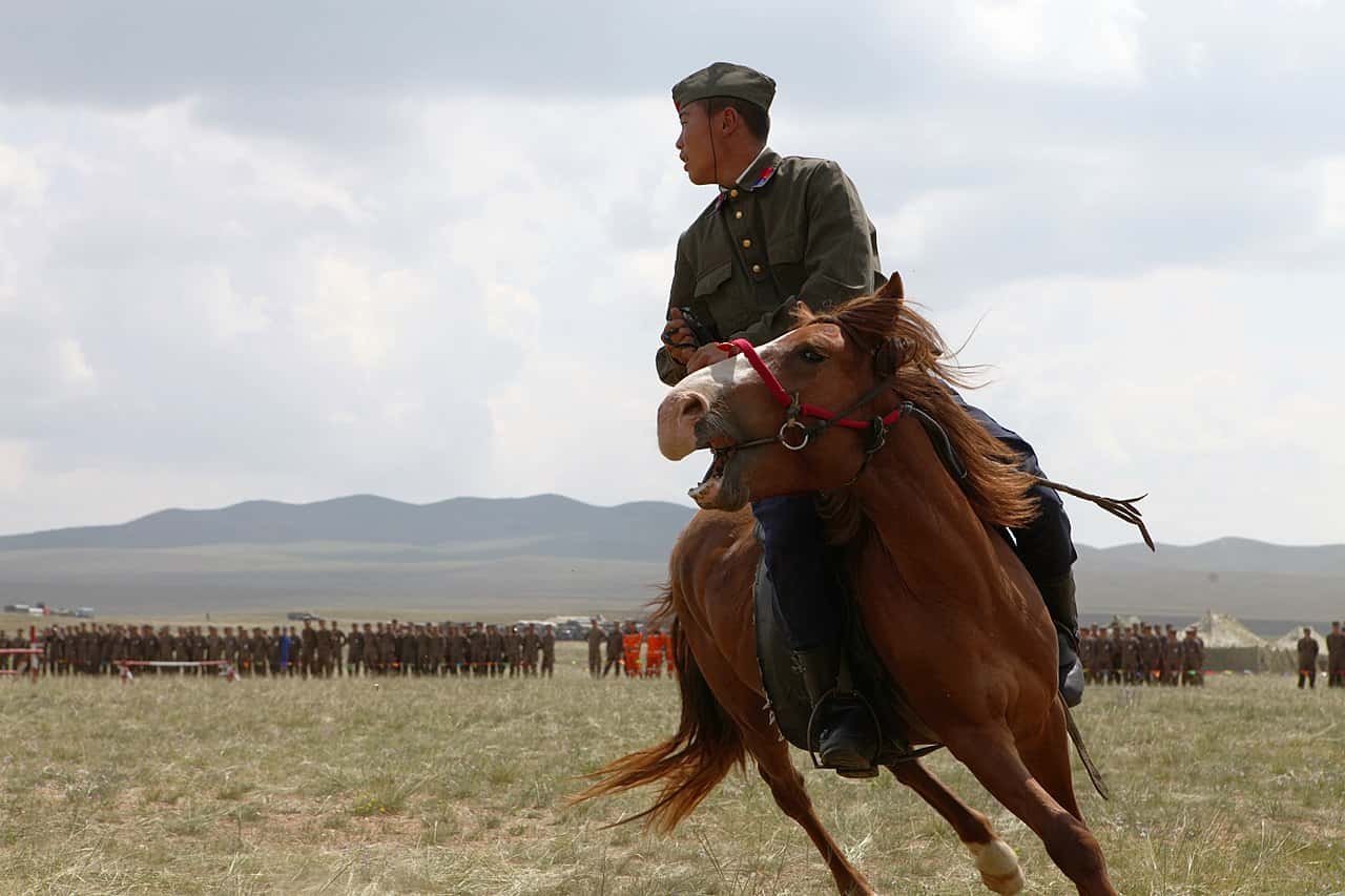 Genghis Khan was a master tactician, often employing clever tricks to defeat his enemy. Some examples include false retreats to bait enemies into ambushes, and tying sticks to horses' tails to kick up dust storms equal to those kicked up by large armies. They would also tie dummies atop horses to make it look like a solider was riding into battle.