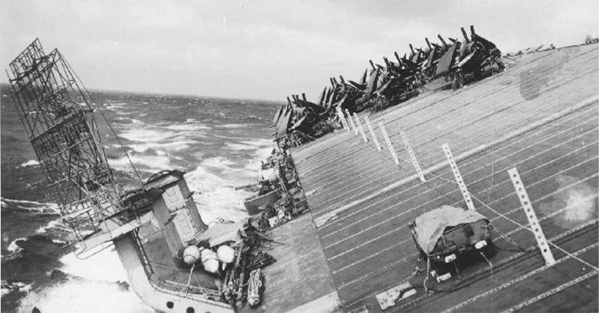 Smaller vessels, especially the destroyers that were already low on fuel, were in grave danger. Some of these ships rolled more than 60 degrees. Aircraft broke free from their restraints and were swept overboard from the decks of their aircraft carriers, causing additional damage and hazards.